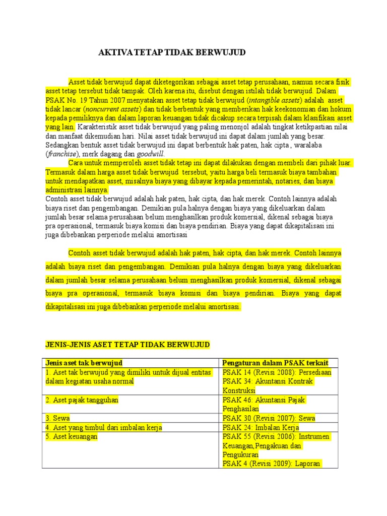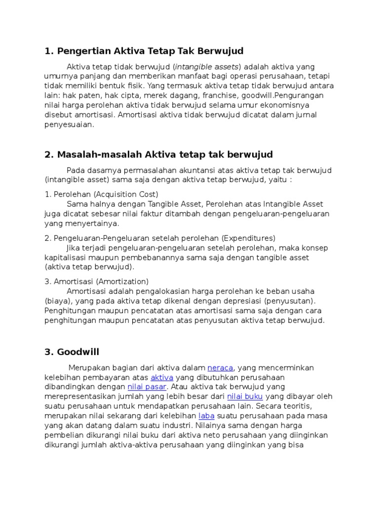 Hebat Akuntansi Aktiva Tetap Berwujud Tangible Assets Akuntansi Dasar 2 from 3.bp.blogspot.com Sehingga untuk memberikan penilaian dari aset ini dilakukan dalam dua pertimbangan. Aktiva tetap tidak berwujud adalah aktiva yang umurnya lebih dari satu tahun dan tidak mempunyai bentuk fisik. Aktiva yang termasuk ke dalam aktiva tetap tidak berwujud adalah merek dagang dan goodwill, hak paten, hak cipta dan franchise. Artinya, aktiva tidak berwujud milik perusahaan ini tidak ditujukan untuk dijual suatu hari nanti. Aktiva tetap adalah aktiva berwujud yang diperoleh dalam bentuk siap pakai atau dibangun lebih dahulu, yang digunakan dalam operasi perusahaan, tidak dimaksudkan untuk dijual dalam rangka kegiatan normal perusahaan dan mempunyai masa manfaat lebih dari satu tahun. Amortisasi adalah alokasi sistematis jumlah tersusutkan suatu asset tidak berwujud selama masa manfaatnya. Aktiva tetap adalah aktiva berwujud yang diperoleh dalam bentuk siap pakai atau dengan dibangun terlebih dahulu yang digunakan dalam operasi dari macammacam aktiva tetap, untuk tujuan akuntansi dilakukan penggolongan sebagai berikut: Aktiva tetap yang umurnya terbatas.
